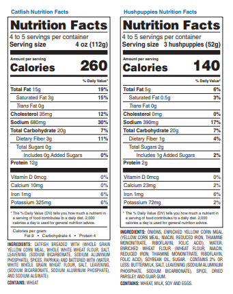 US Farm Raised Catfish Battered with: Water, White Whole Grain Wheat Flour, Salt, Leavening (Sodium Bicarbonate, Sodium Aluminum Phosphate), and Sodium Alginate. Breaded with: Whole Grain Yellow Corn Meal, Whole White Wheat Flour, Salt, Leavening (Sodium Bicarbonate, Sodium Aluminum Phosphate), Spices and Paprika. Fried in Soybean Oil. Regular Hushpuppies: Onions, Enriched Yellow Corn Meal (yellow corn meal, niacin, reduced iron, thiamine mononitrate, riboflavin, folic acid), Water, Enriched Wheat Flour (wheat flour, niacin, reduced iron, thiamine mononitrate, riboflavin, folic acid), Soybean Oil, Sugar. Contains 2% or less: buttermilk, salt, leavening (sodium aluminum phosphate, sodium bicarbonate), spice, dried parsley, and guar gum.