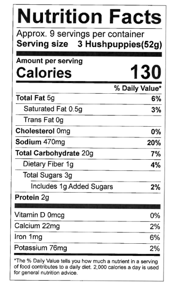 Ingredients: Enriched Yellow Corn Meal (yellow corn meal, niacin, reduced iron, thiamine mononitrate, riboflavin, folic acid), Onions, Enriched Wheat Flour (wheat flour, niacin, reduced iron, thiamine mononitrate, riboflavin, folic acid), Water, Soybean Oil, Jalapeño Peppers (vinegar, salt, acetic acid), Sugar. Contains 2% or less: buttermilk solids, salt, leavening (sodium bicarbonate, sodium aluminum phosphate), spice, dried parsley and guar gum. Contains: Wheat, Milk, Soy and Eggs.
